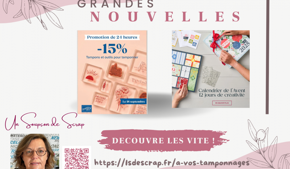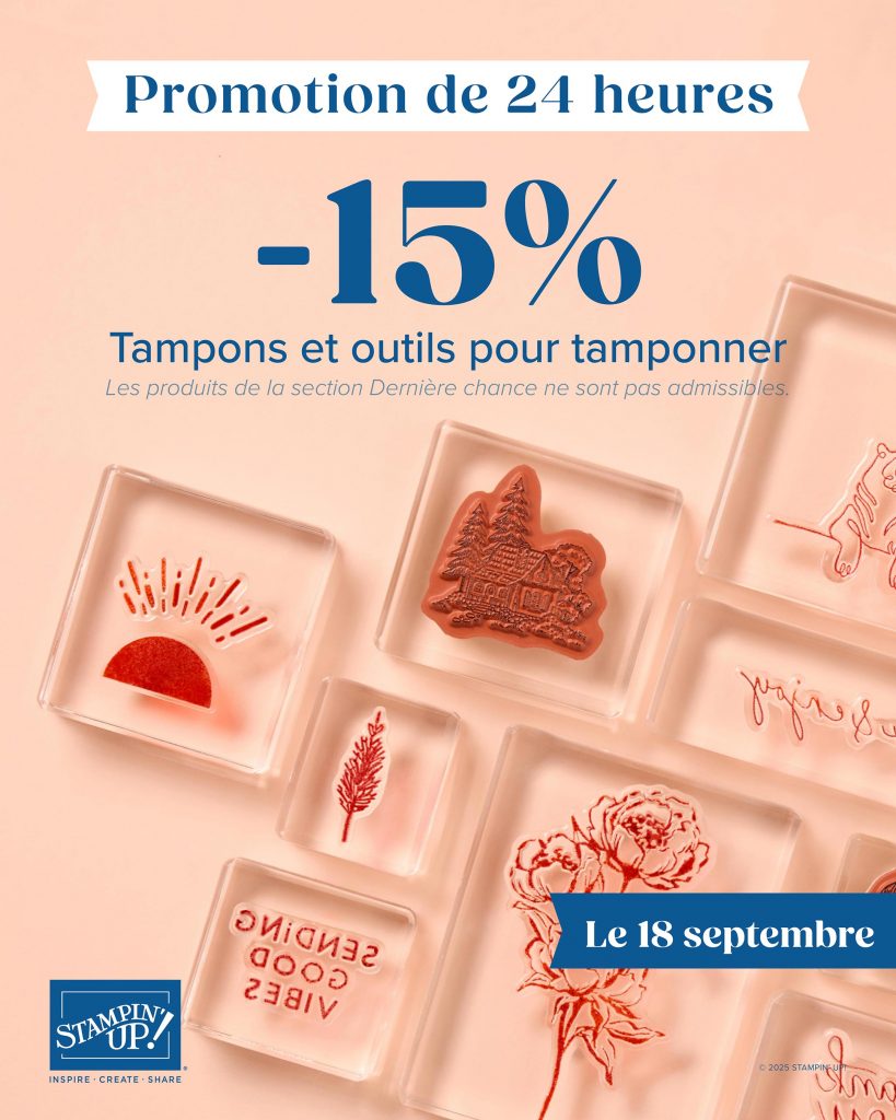Stampin’Up! nous offre -15 % sur les tampons et les outils à tamponner 🤩 C’est le moment parfait pour compléter (ou démarrer !) votre collection 🖌️✨