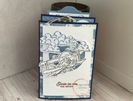 Voici une petite attention à offrir. Cela peut être un chocolat, une carte cadeau, un gentil message. Glissée dans un étui bleu nuit, avec la magnifique collection « conquérir le ciel », c’est une attention qui marquera les esprits. Voici la 3ème création que tu pouvais réaliser avec ton kit créatif de mai. Pour un anniversaire, une …