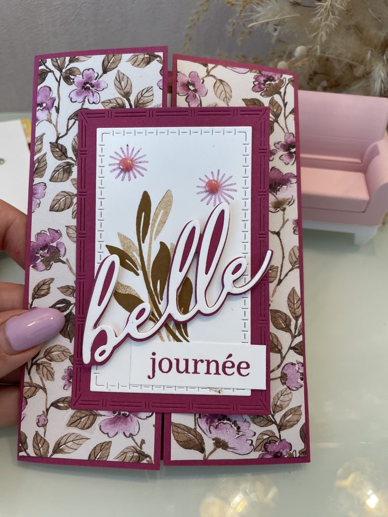 Pour la dernière carte, j’ai juste utilisé le set de tampons. Le papier est la nouvelle collection « charme fleuri » que tu pourras retrouver dans le kit du mois d’août.