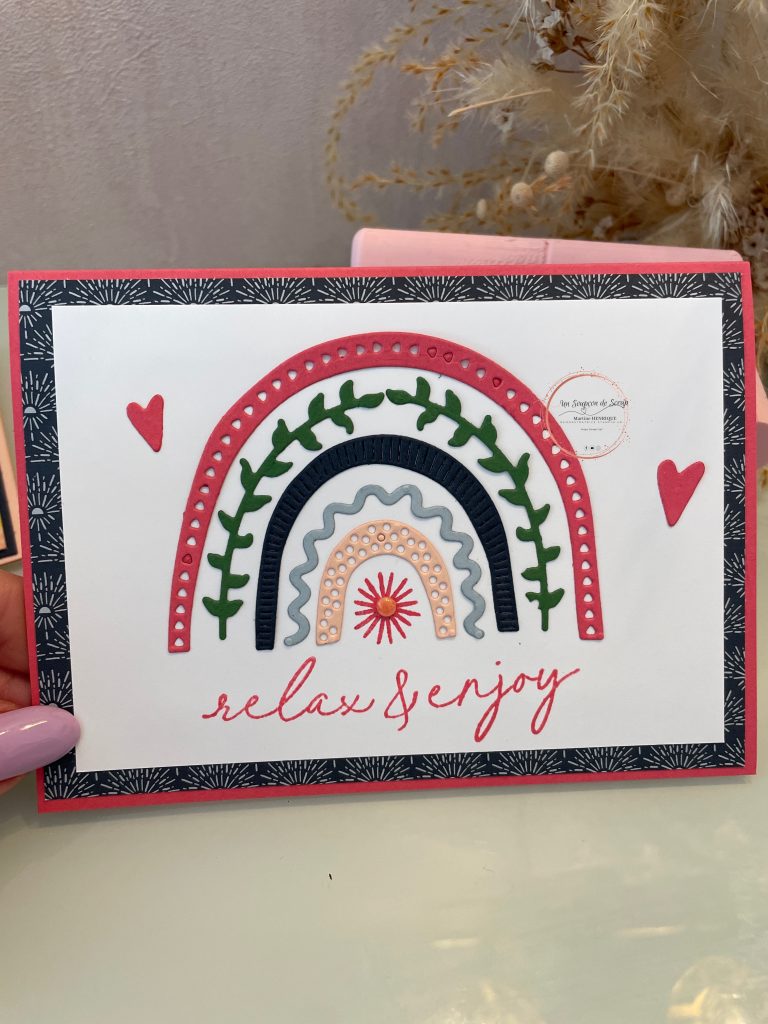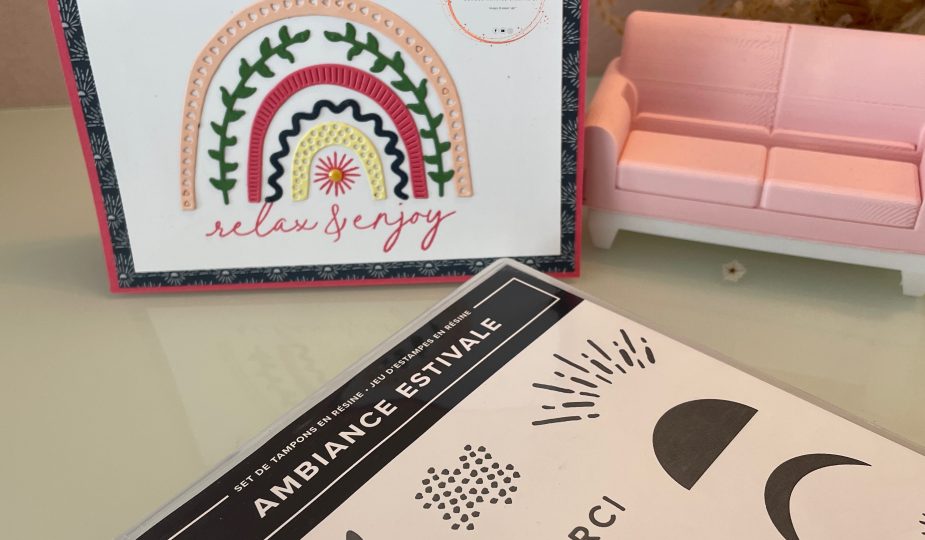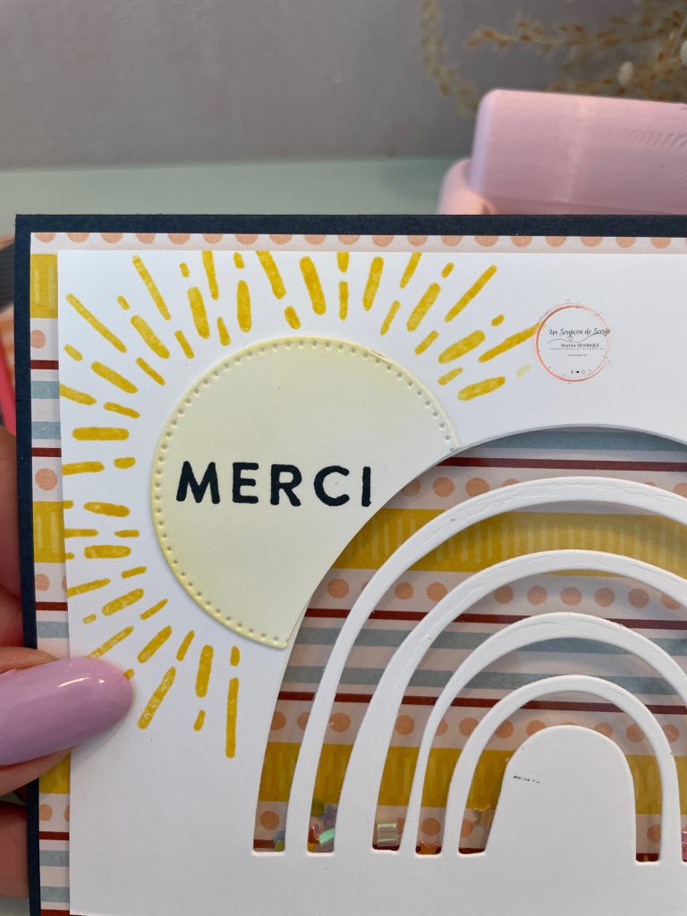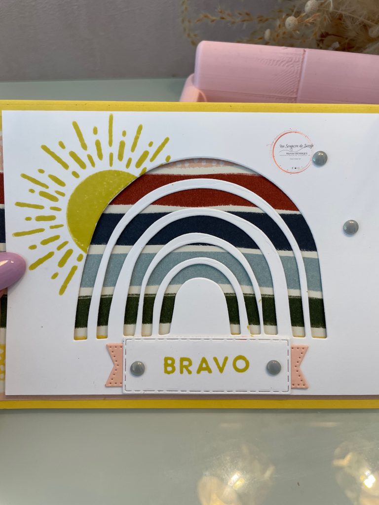 Voici la deuxième qui utilise la découpe de l’arc en ciel et le soleil du set de tampons. Simplement collé sur un papier design, pour un joli effet.