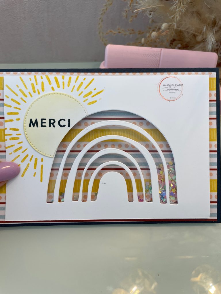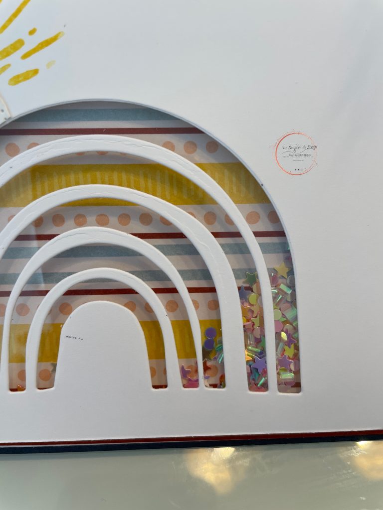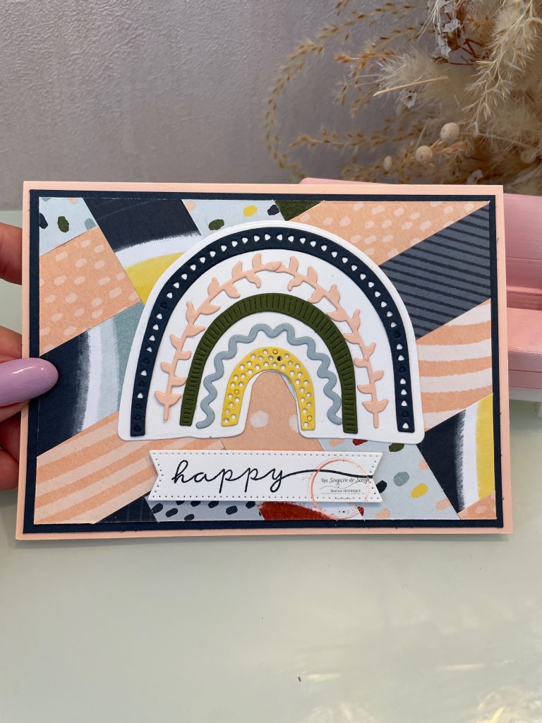 Voici une 4e carte, qui utilise la découpe du fond de l’arc en ciel et un joli jeu de chute du papier design.