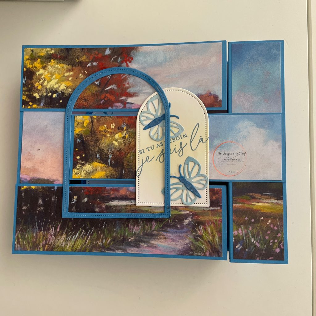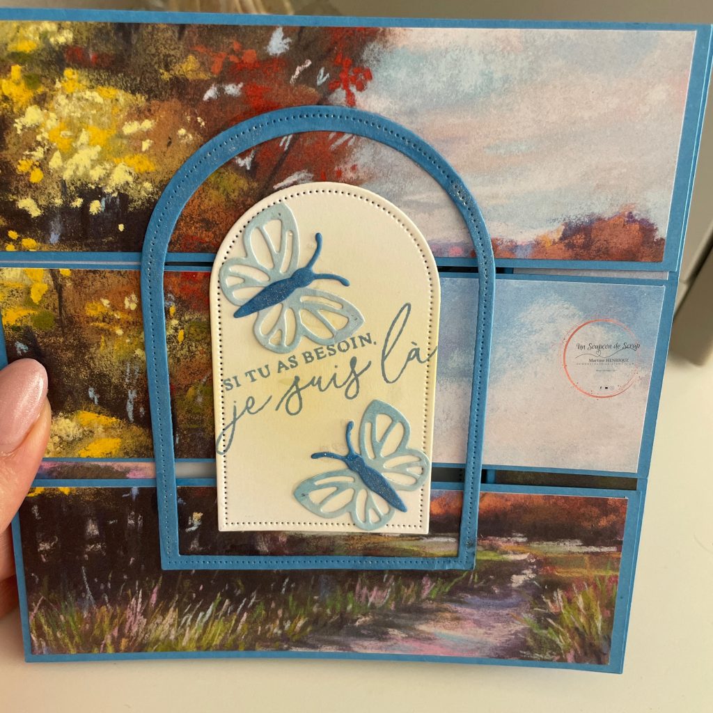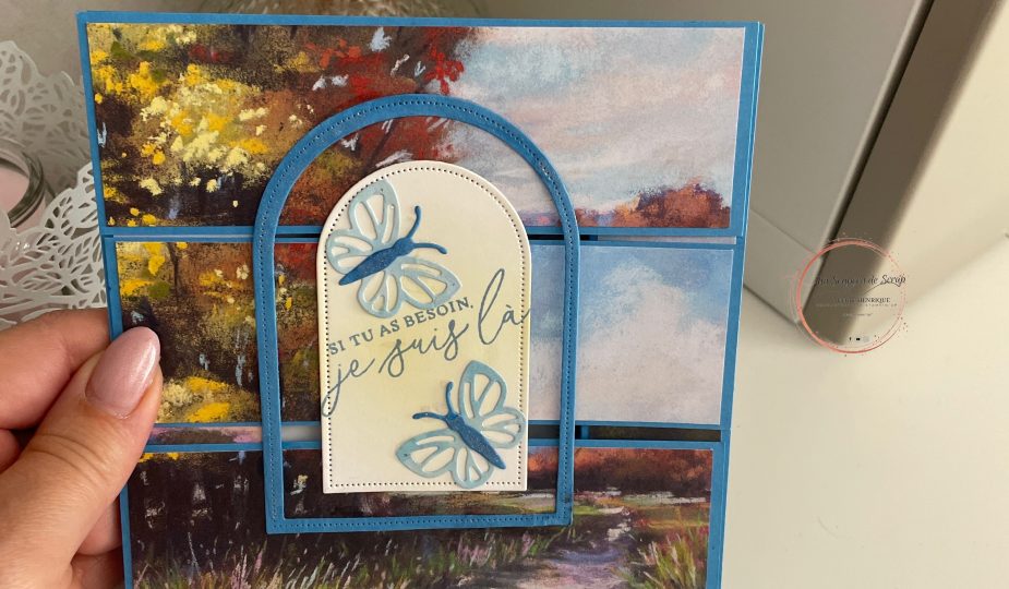 J’ai mixé mes collections : promenades et rêverie et splendeurs automnales pour cette carte au bleu « après-midi d’azur ».