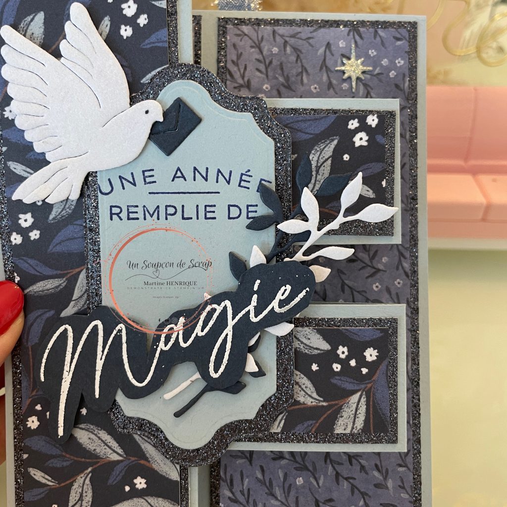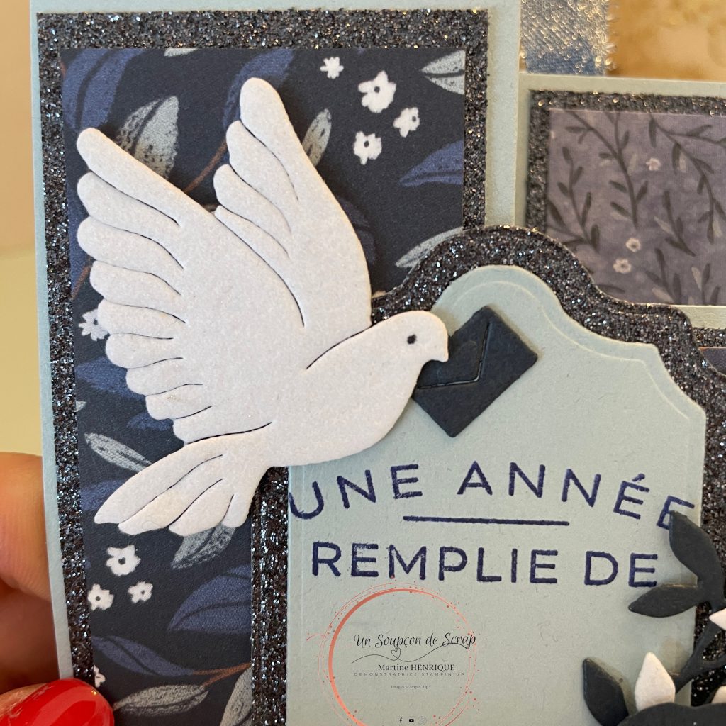 Je crois que j’ai utilisé tous les produits de la collection pour réaliser la carte aujourd’hui, j’ai même ajouté des paillettes avec mon Stella sur la colombe en velours.