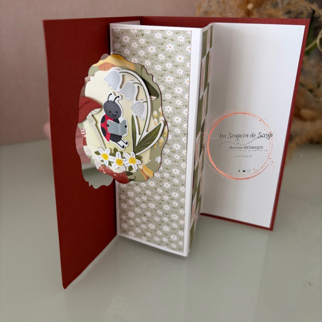 Une carte originale qui s’ouvre tout en laissant apparaître l’image de la couverture à l’intérieur. Comme une petite fenêtre ouverte sur le décor… et sur la créativité !