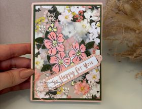 J’ai marié les couleurs chaudes « papaye pâle » et le chic de « vert épinette ». J’ai découpé les bords avec le poinçon de « décoration tropicales ».