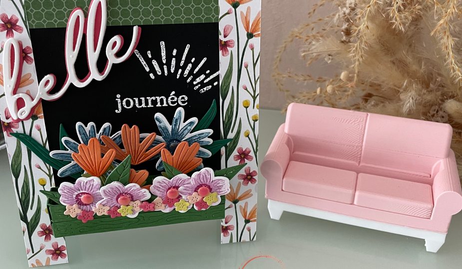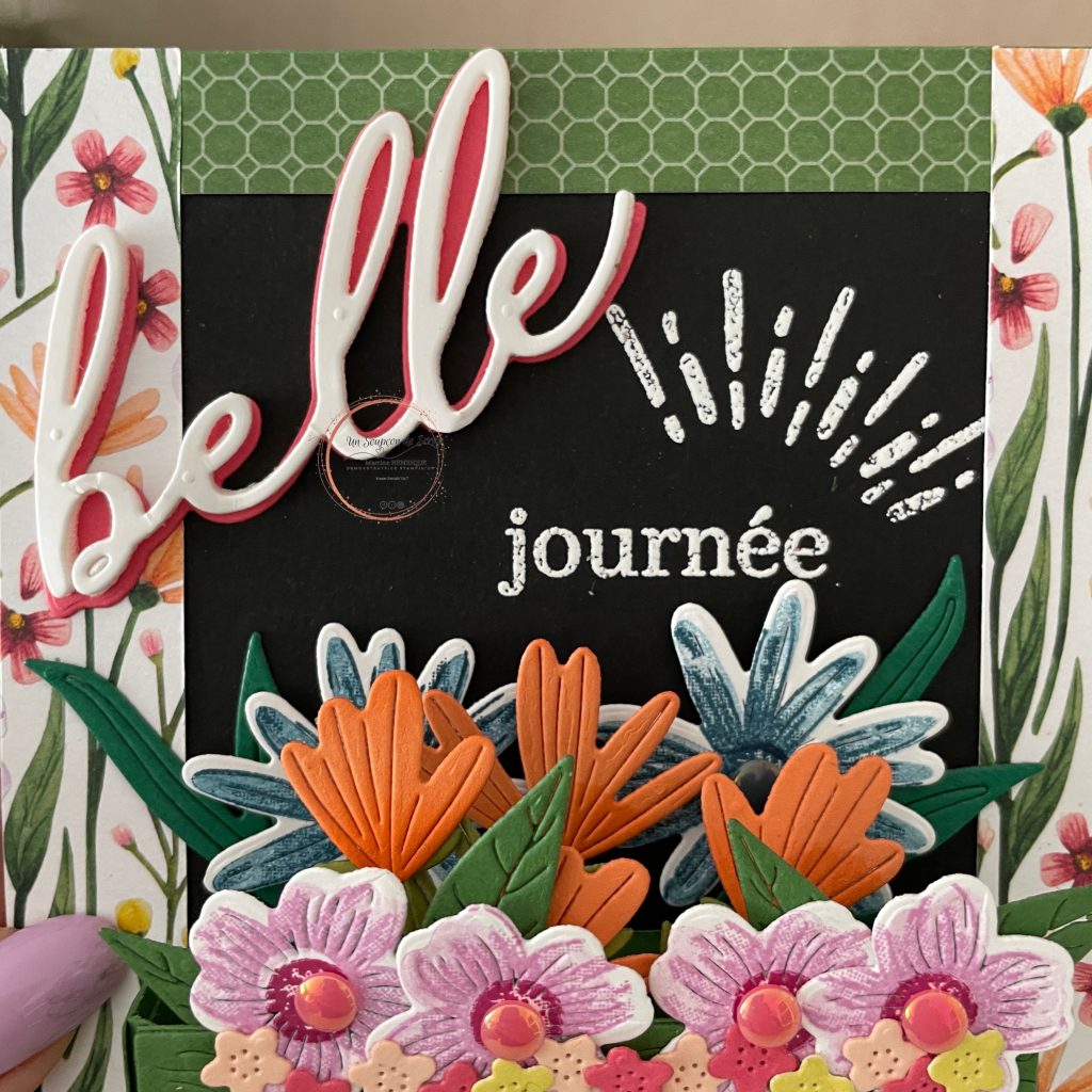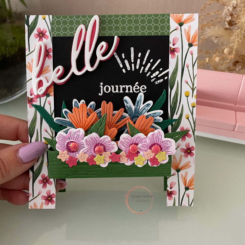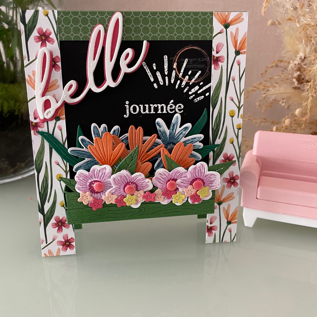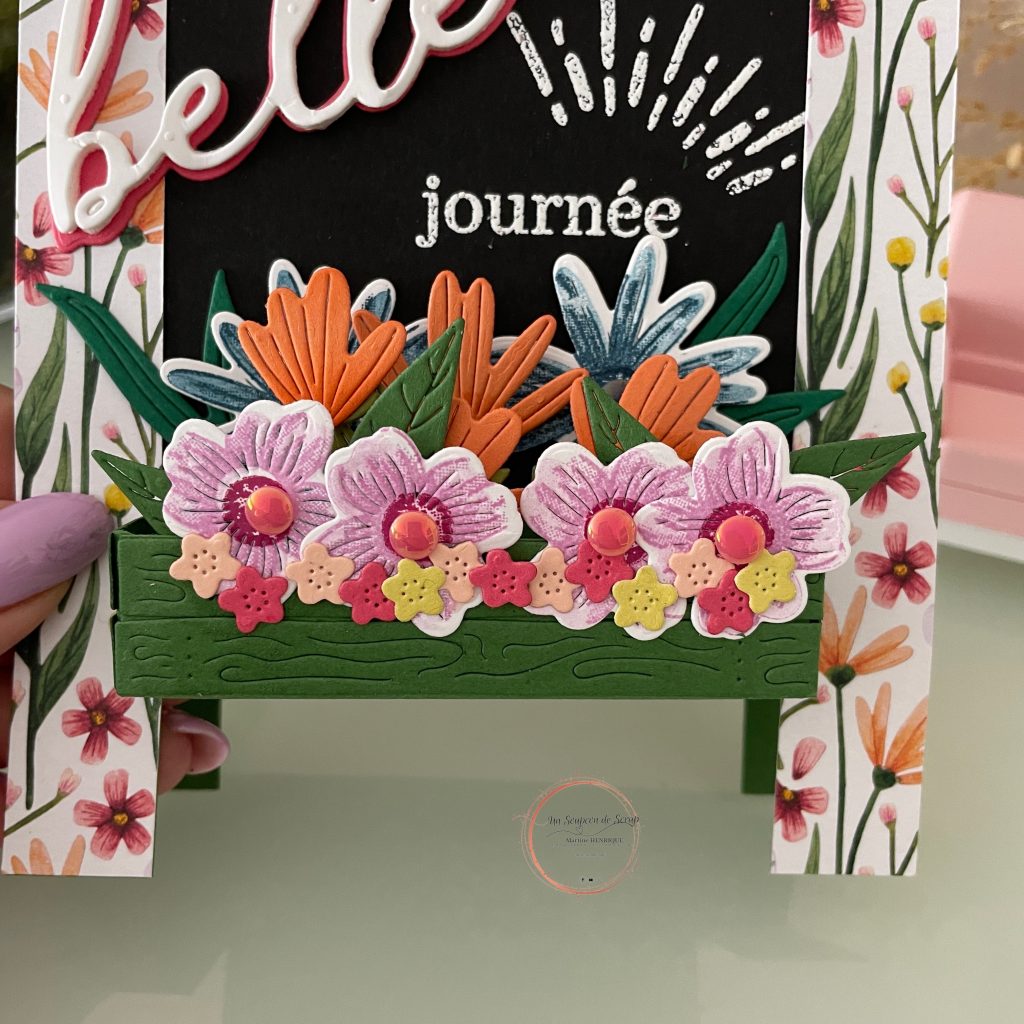 Voici le tutoriel du tableau fleuri. C’est une création originale, elle demande un peu de patience pour garnir la jardinière, mais sinon c’est une carte très facile.