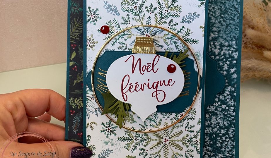 Pour une carte qui me ressemble vraiment, j’ai utilisé mes coups de coeur de la saison : les cercles dorés et le velours un peu de douceur.