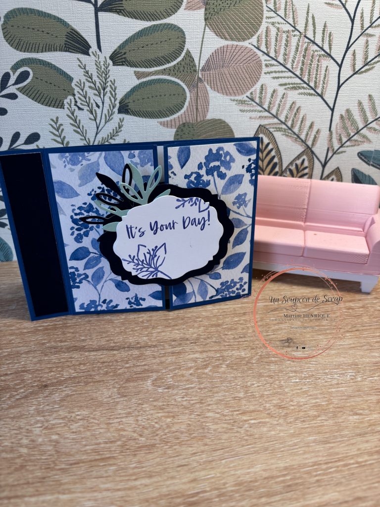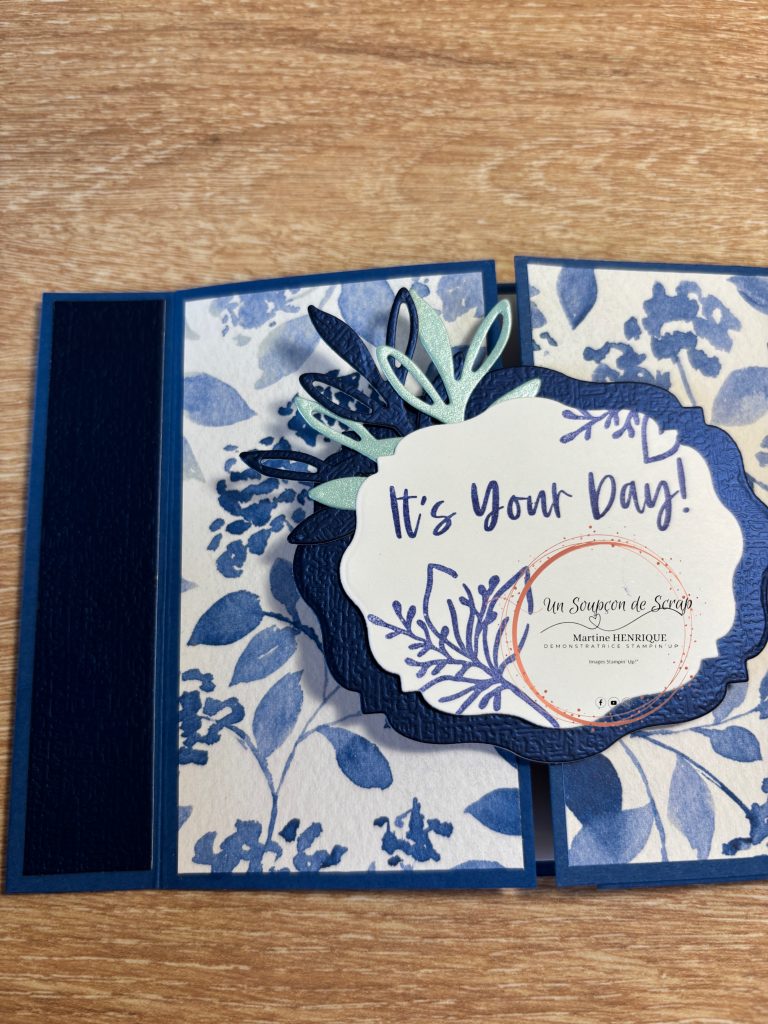 Pour cette version, j’ai eu envie de mettre en valeur différents papiers métallisés, en jouant avec un magnifique camaïeu de bleus. De quoi illuminer le papier design et apporter une touche raffinée à l’ensemble 💙