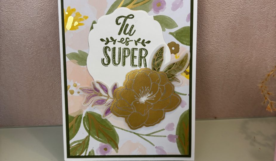 La collection « Charmant et splendide » s’est imposée comme une évidence pour cette carte. La douceur de ses motifs floraux se marie à merveille avec le caractère affirmé des papiers Corail Calypso, créant un contraste à la fois harmonieux et lumineux.