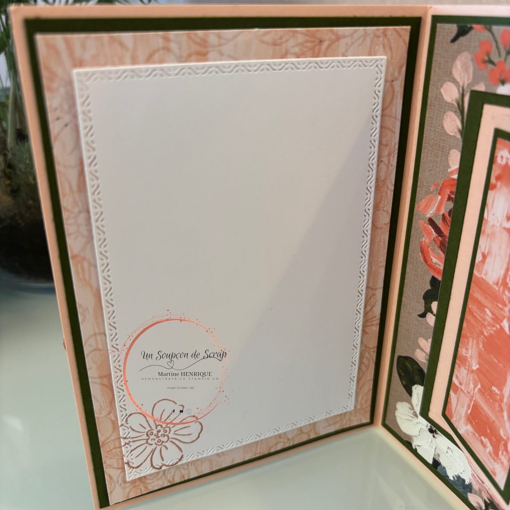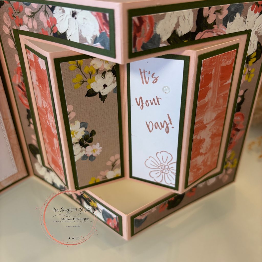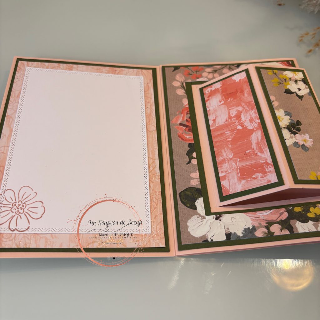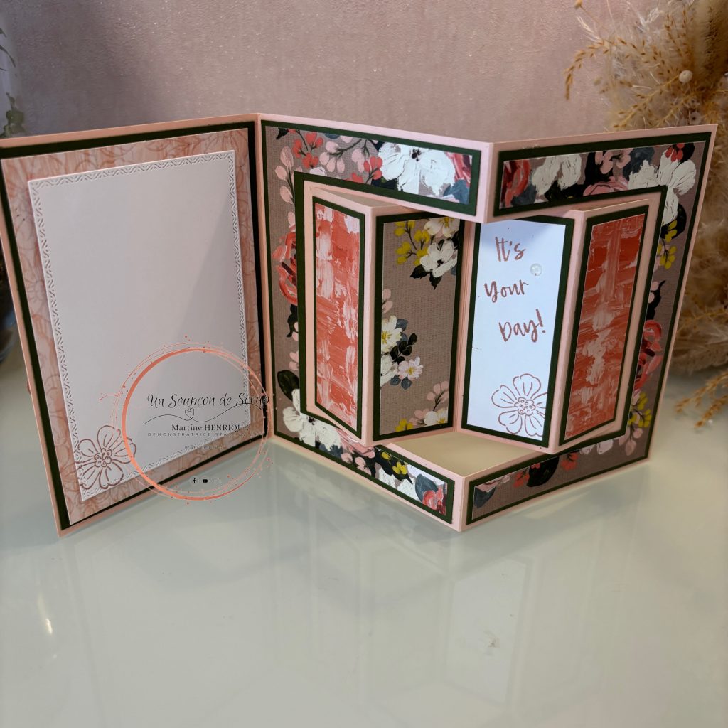 C’est une carte superbe que tu pourras offrir avec plaisir. Elle tient debout et ses jolis panneaux vont pouvoir accueillir tes jolis papiers, ou tamponnages.